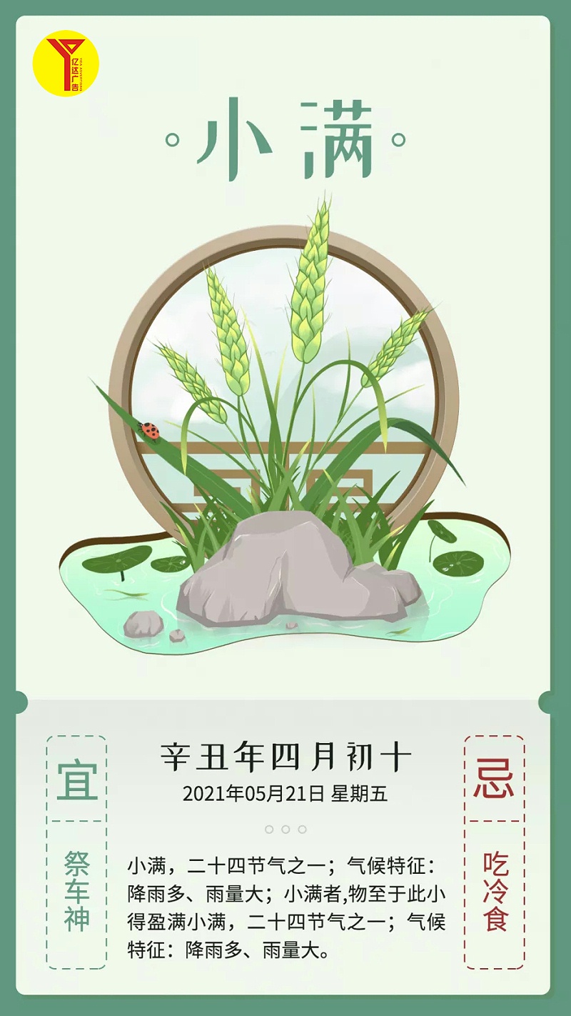 亿达墙体广告专业、专注墙体广告17年,2021年5月21日恰逢二十四节气中的第八个节气小满,在此亿达墙体广告 小编提醒大家,小满后,天气渐渐由暖变热,并且降水也会逐渐增多,民谚有“小满大满江河满”的说法。小满,标志着炎夏登场。物至于此,小得盈满:麦类等夏熟作物籽粒饱满但未成熟,故称小满。